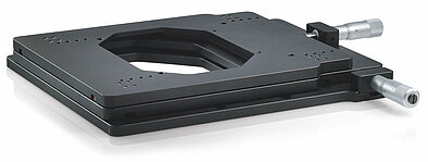 For manual sample positioning, PI offers the M-545 microscope XY stage. This stage is moved using micrometer screws and offers travel ranges to 25 x 25 mm. Thanks to just 30 mm height, the M-545 has a very low profile and it is compatible with a large number of inverse microscopes of leading manufacturers.