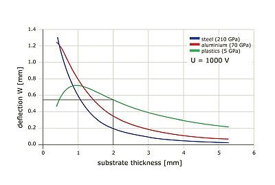 To evaluate the free strain W0 and the blocking force FBW, charts can be used which show, for example, the achievable displacements and forces as a function of the thickness and stiffness of the substrate used. The two graphs are plotted based on two substrates with a length of 50 mm made from different materials to which a DuraAct type P-876.A15 patch transducer is mounted. Together with the performance graph, the bending actuator graphs provide an effective basis for evaluating the performance and behavior of an actuator for a specific application. For this reason, they are provided on every datasheet.