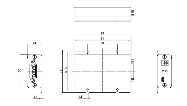 USB interface for commanding. Differential signal transmission (A/B). TTL inputs for limit and reference point switches.