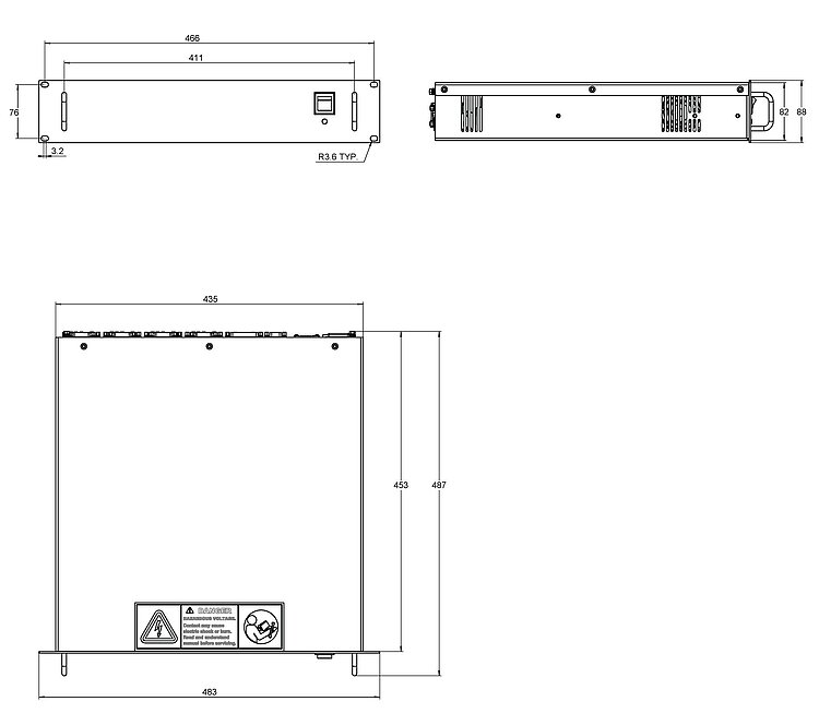 Dimensions  | 482.6 mm (19'') × 453 mm (17.8'' = 2U) × 89 mm (3.5'')  |