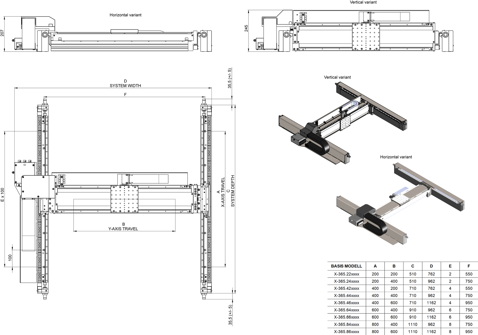 | Travel range in X | 200 mm, 400 mm, 600 mm, 800 mm | X: Gantry axis |