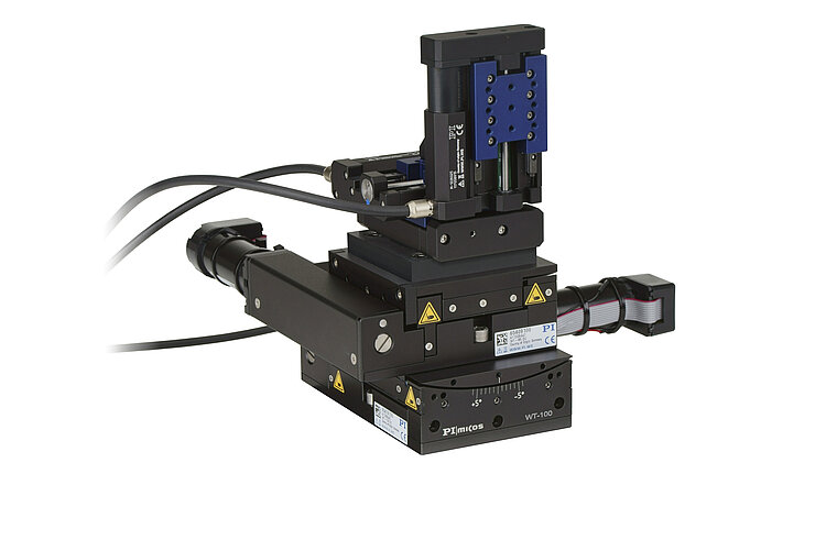 The XYZ setup of the fiber alignment system consists of three motorized linear stages from the M-122 series for linear motion, and the WT-85 and WT-100 goniometers for angular motion. All stages are distinguished by their high precision and robustness. Because all drives are equipped with position sensors, it is possible for example, to reliably prevent collisions with expensive silicon wafers.