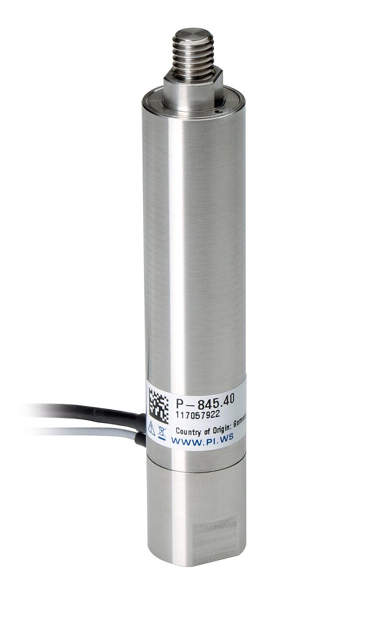 Preloaded piezo actuator; PICMA® piezo actuator drive; 60 µm travel range; 101 mm length; push force capacity 3000 N; pull force capacity 700 N; SGS, direct position measuring; LEMO connectors; 1 m cable length