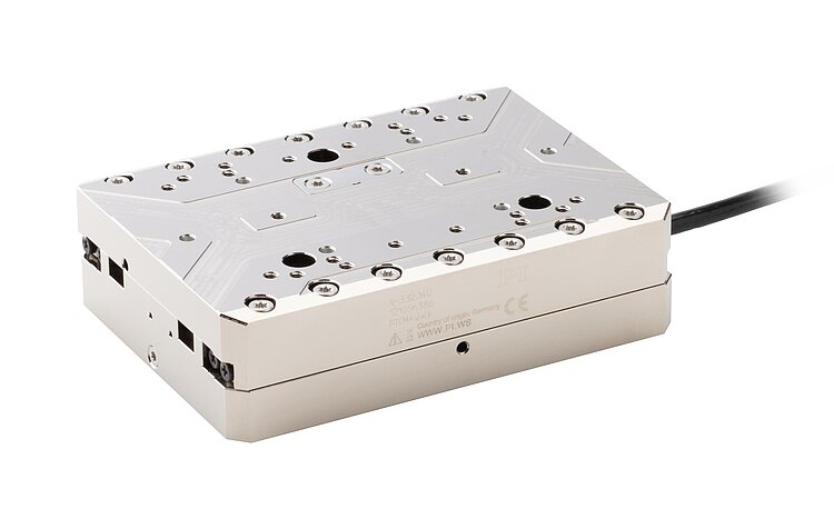 Linear stage with greatest force and precision; PICMAWalk; 25 mm travel range; 150 N load capacity; 12 mm/s maximum velocity; incremental linear encoder; vacuum compatible to 10-9 hPa; 1 m cable length; downward cable exit