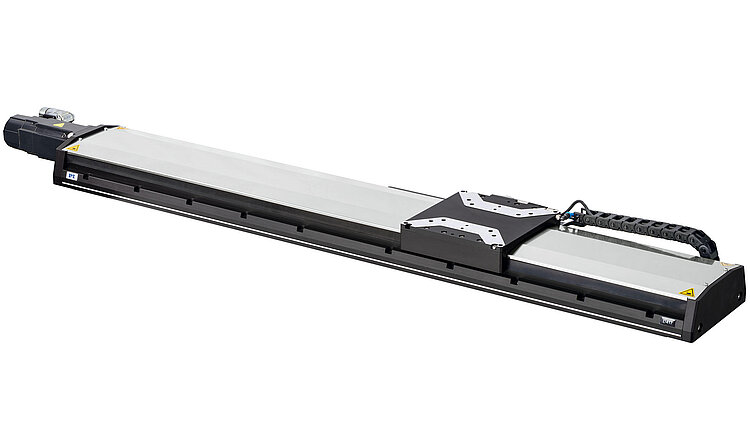 High-load linear stage; synchronous servo motor to 320 V; 813 mm travel range; 450 N load capacity; 300 mm/s maximum velocity; ball screw; incremental rotary encoder, 20000 cts./rev. resolution, A/B quadrature, RS-422; incremental linear encoder, 20 µm sensor signal period, sin/cos, 1 V peak-peak; electromagnetic safety brake; 166 mm width, drag chain