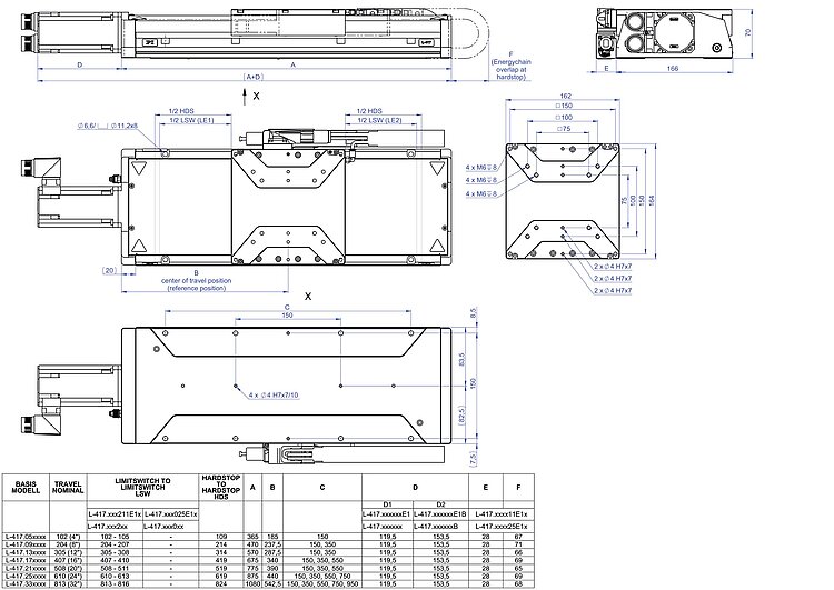 - Versions with linear encoder with drag chain and connection box (L-417.xxxxxxE1).