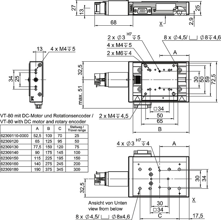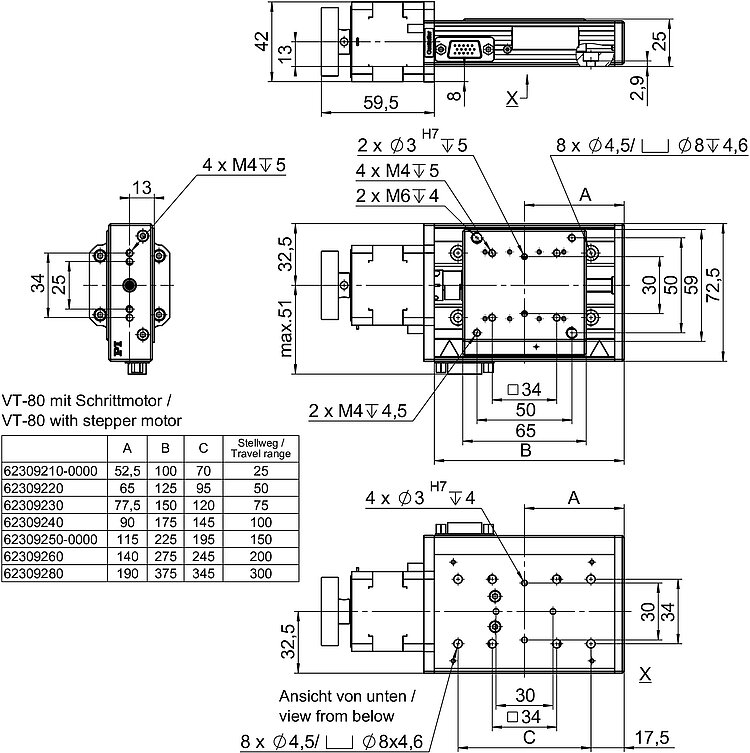 | Travel range in X | 25 mm | 50 mm | 75 mm | 100 mm | 150 mm | 200 mm | 300 mm | 25 mm | 50 mm | 75 mm | 100 mm | 150 mm | 200 mm | 300 mm | |