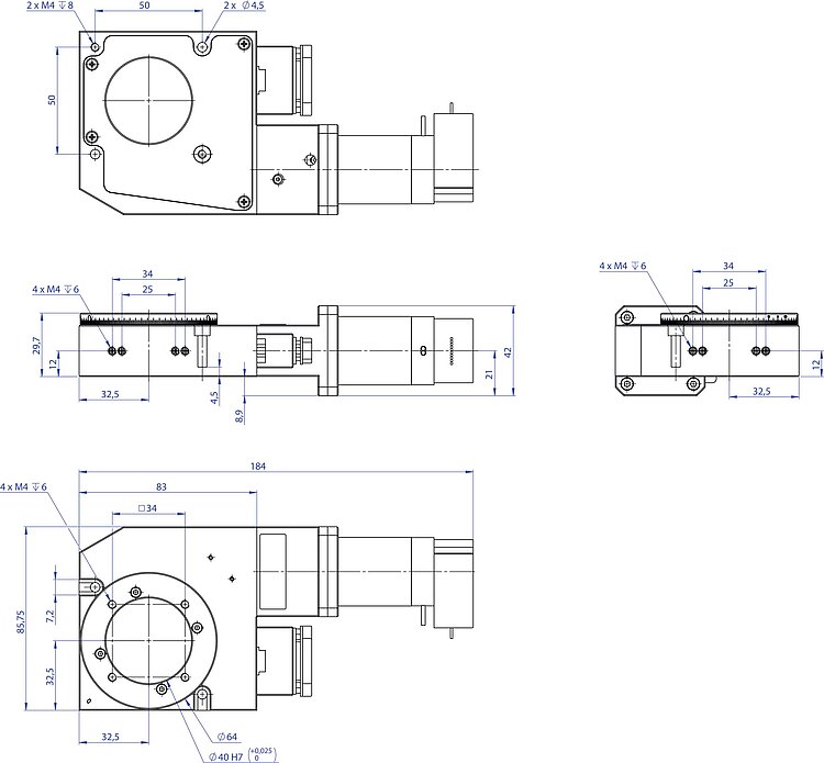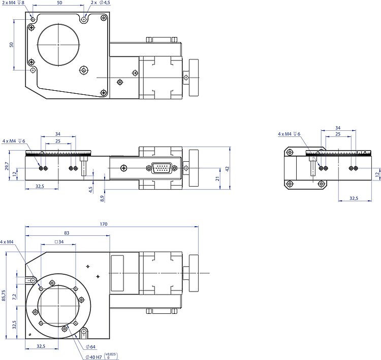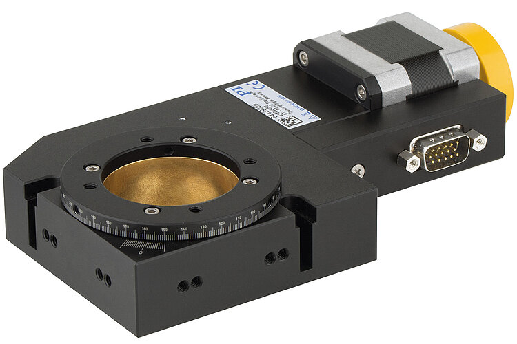 Worm drive with high gear ratio for precision positioning. Large aperture with 40 mm Ø. Mechanical reference switch.