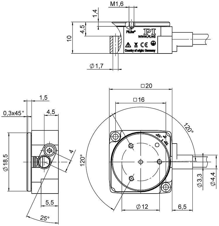 PILine® rotation stage; PILine® piezo motor, performance class 1; >360 ° rotational angle; 0.3 N load capacity; 720 °/s maximum angular velocity; incremental angle measuring system, 175 µrad sensor resolution; 1.5 m cable length