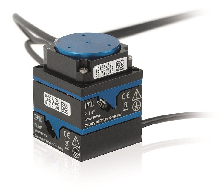 PILine® rotation stage; PILine® piezo motor, performance class 1; >360 ° rotational angle; 1 N load capacity; 720 °/s maximum angular velocity; incremental angle measuring system, 35 µrad sensor resolution; 1.5 m cable length