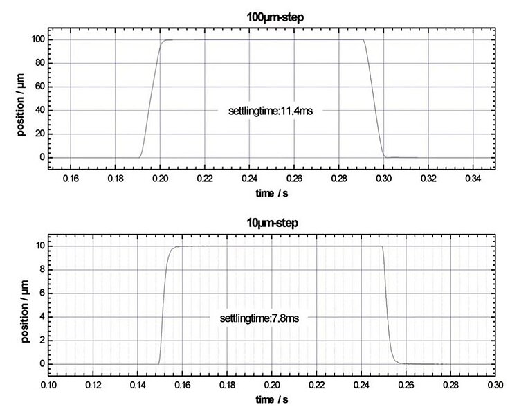 The resolution of the system is limited only by the noise of the amplifier and the measuring technology because PI piezo nanopositioning systems are free of friction.