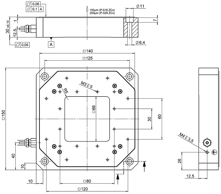 - Travel range in Z / tip/tilt angle to 200 µm / 2 mrad, closed loop (to 240 µm / 2.4 mrad open loop)