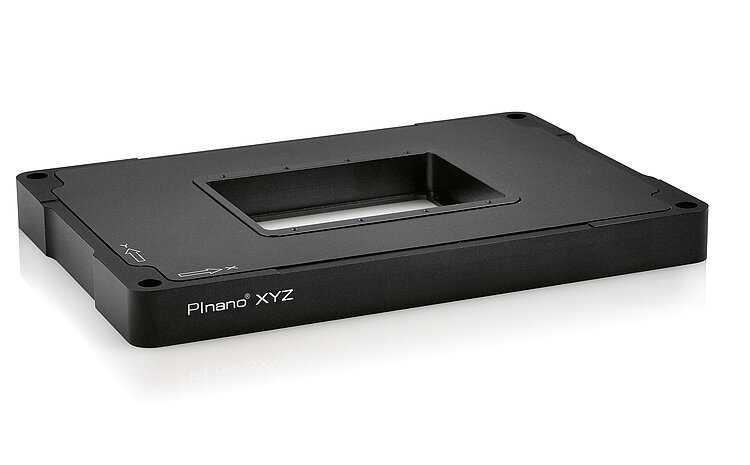 PInano® XYZ piezo system; clear aperture for microscope slides; 200 µm × 200 µm × 200 µm travel range (X × Y × Z); piezoresistive, direct position measuring; D-sub 37 (m) connector; 1.7 m cable length; with USB digital controller