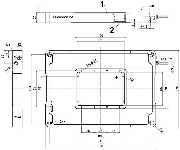 PInano® XY piezo system; clear aperture for microscope slides; 200 µm × 200 µm travel range (X × Y); piezoresistive, direct position measuring; D-sub 37 (m) connector; 1.7 m cable length; with USB digital controller