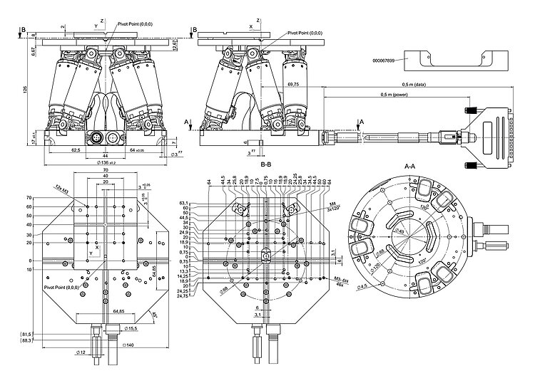 Miniature hexapod for optical alignment; removable magnetic plate; BLDC motor; 5 kg payload; 20 mm/s velocity; 0.5 m cable length. Connecting cables are not included in the scope of delivery and must be ordered separately.