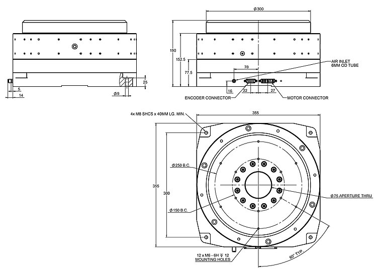 PIglide RM rotation stage, air bearing, 300 mm motion platform diameter, 75 mm journal length, incremental angle measuring system with sin/cos signal transmission, 47200 lines/revolution, slotless, brushless 3-phase torque motor
