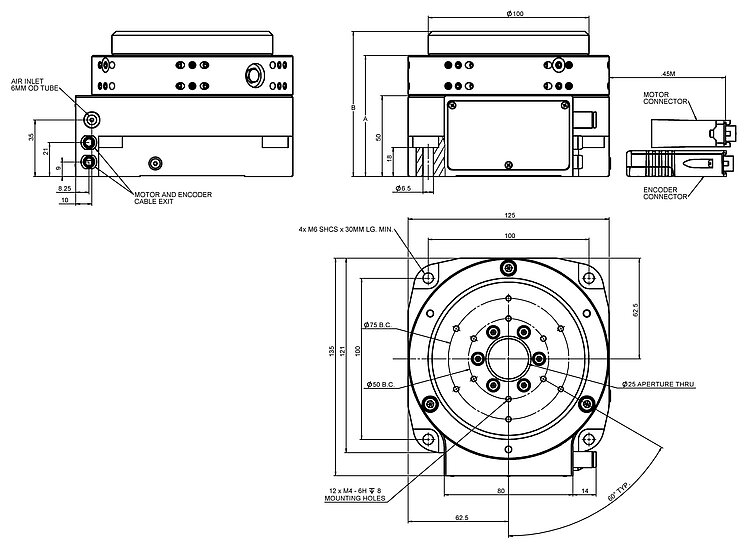 PIglide RM rotation stage, air bearing, 100 mm motion platform diameter, 25 mm journal length, incremental angle measuring system with sin/cos signal transmission, 15744 lines/revolution, slotless, brushless 3-phase torque motor