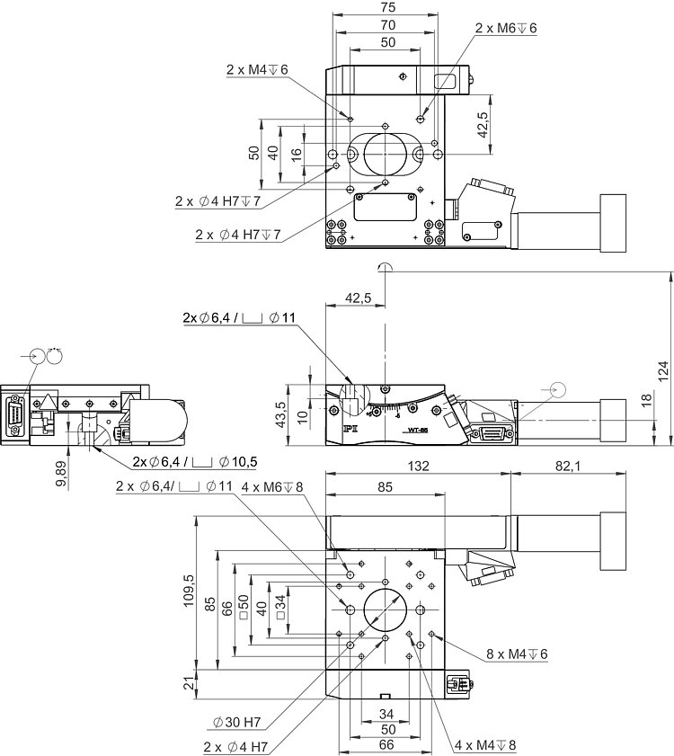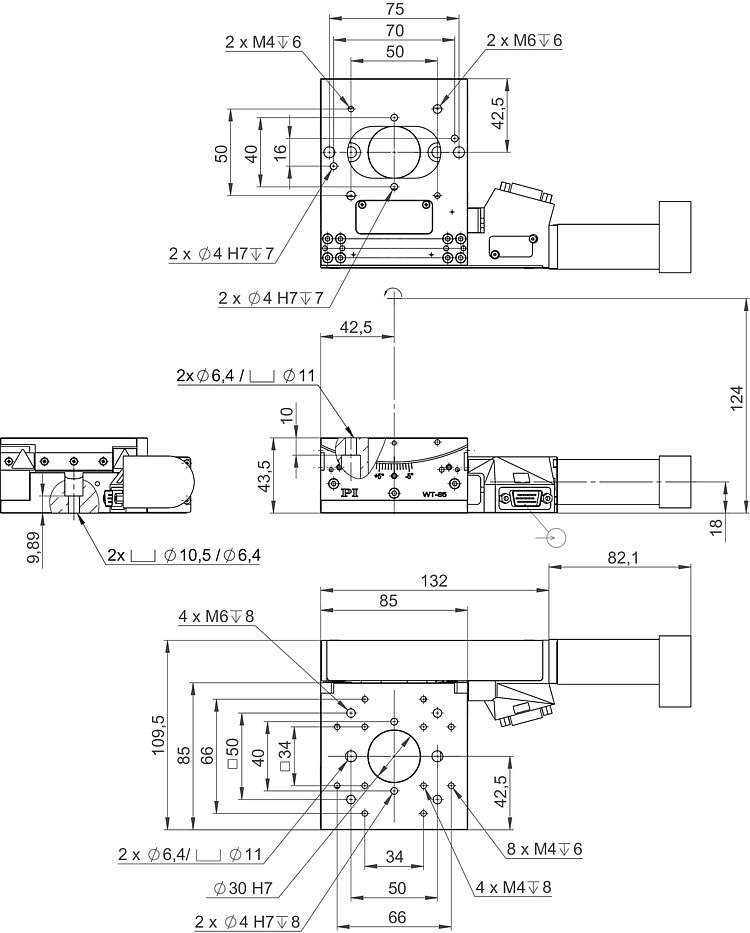 WT-85 goniometer stage, 85 mm width, DC motor, ±5° rotation range, angle measuring system with A/B quadrature signal transmission, clear aperture 30 mm diameter, mechanical limit switches
