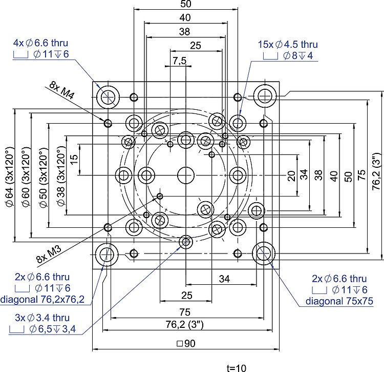 Adapter plate for mounting M-110, M-111, M-112 linear stages on honeycomb tables (metric and imperial)