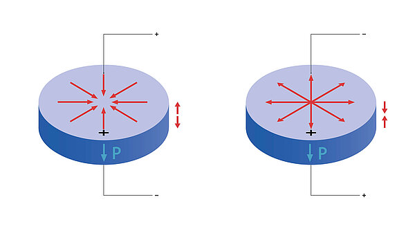 Polarization directionDepending on the design of the piezo components, it is possible to achieve displacements in an axial and radial direction. For further information see >> Operating Modes.